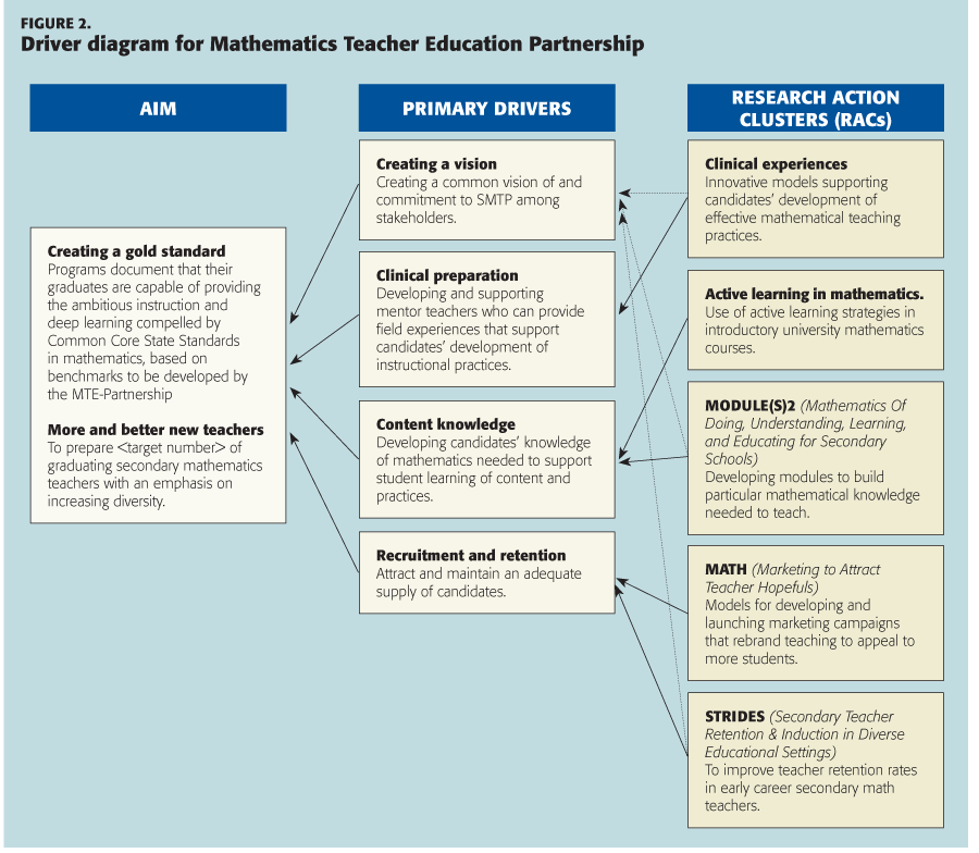 The entire NIC comprised 38 higher education institutions and nearby local school districts. To coordinate and enhance the work, Martin and Gobstein came up with the notion of research action clusters (RACs) — that is, smaller subproblem-focused teams within the emerging NIC. Each cluster shared a commitment to developing common theory, illustrated in the driver diagram, shown in Figure 2 (Martin & Gobstein, 2015). The goal of the common theory is to tackle the aim by specifying what about the problem will be addressed by when. Moreover, each cluster would use the common theory to align itself with the subproblem most deeply felt in its locality. For example, one research action cluster focused on improving teacher retention rates in early-career secondary math teachers. This approach enabled each cluster to own a problem that was prominent for its local constituents; at the same time, its work would be coordinated within the greater NIC by a common theory.