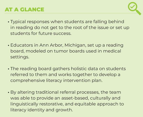 As instructional leaders for Ann Arbor Public Schools in Michigan, we sought an alternative to the traditional response to intervention model used in the district at the time. Our goal was to acknowledge and address the depth and breadth of individualized diagnoses, instructional needs, and social injustice. In addition, we wanted to subvert the overrepresentation of subgroups of students, primarily students of color, in special education. The answer turned out to be a districtwide reading board.