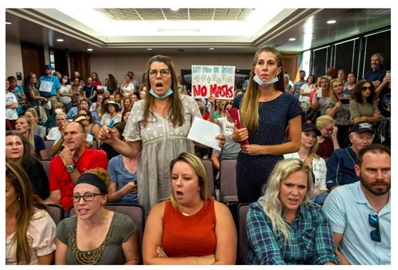 Above: Right from the start, school shutdowns and mask requirements were controversial. This memorable early image comes from the Salt Lake Tribune’s story: In separate rallies, Utahns protest mask mandate and demand in-person classes.