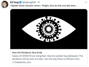 | Above: Ed Yong is back in The Atlantic with How the Pandemic Now Ends, in which he reports on (among other things) the case for reopening schools in person with as many safeguards as possible.