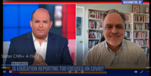 Above: CNN’s Brian Stelter (left) debates education coverage with longtime education reporter Greg Toppo (right).