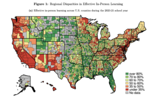 Above: A report from the IZA Institute of Labor Economics measured regional disparities in effective in-person learning during the 2020-2021 school year, with the areas in green being most effective. Jacksonville, Florida, came out on top, with Riverside-San Bernardino-Ontario, California, on the lowest end. (H/T to John Bailey and his COVID-19 Policy Update newsletter.)