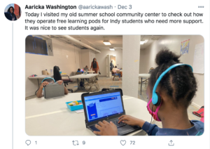 | Chalkbeat Indiana reporter Aaricka Washington returned to her old stomping grounds at the summer school community center in her hometown to see how their free learning pods are operating. “This is the neighborhood I grew up in,” she tweeted. “The students need it.” |
