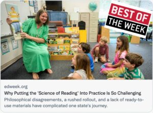 🏆 BEST: The best story of the week is Why Putting the ‘Science of Reading’ Into Practice Is So Challenging by Sarah Schwartz in Education Week. We’ve been hearing a lot lately about the “science of reading” — thanks largely to Emily Hanford’s pioneering work — but this story stands out for its up-close look at implementing the technique in the classroom. Schwartz focuses on North Carolina, one of more than two dozen states transforming their reading instruction to align it more with what the science says works. She talks to educators who, after decades of teaching reading one way, are trying to change. Some are confused, others hesitant, still others hopeful. “Your philosophy on reading is as deep as religion,” says one principal. “I felt like a lot of it was giving me background knowledge,” said a kindergarten teacher in Schwartz’s story. “But I wasn’t getting — how do you apply it?” The story thoroughly explains how the “science of reading” works, and sheds light on the depth of the controversy surrounding it, all while bringing us into vibrant classroom scenes. It’s a great example of how to report a policy story with a human angle.
