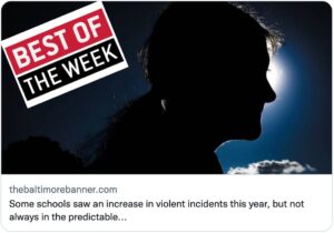 🏆 BEST: The best story of the week is Some schools saw an increase in violent incidents this year, but not always in the predictable places by Liz Bowie in the recently launched Baltimore Banner. Leave it to veteran Bowie to offer a helpful counter-narrative, acknowledging that there has been a rise in violent incidents across Baltimore County and the nation while pointing out where the rises are happening — and where they’re not. Some of the state’s largest school systems, including Baltimore City, which have served historically marginalized students, are actually seeing decreases. Why? No one knows for sure, but one source speculates that these districts are more used to dealing with difficult student behavior and are more proactive in solving disagreements between students before they escalate. They’ve also been working for longer to reduce punishment and resolve root causes of student misbehavior. “These systems are taking an intentional, different approach,” said the state superintendent. This is an important part of the student behavior story, and it sheds light on potential solutions in addition to just the problem.