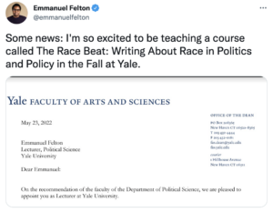 Washington Post race and ethnicity reporter and former Hechinger Report staffer Emmanuel Felton will be teaching a course at Yale in the fall on writing about race in politics and policy. Where can we sign up?