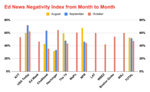 Above: Cafeteria Duty’s new review of October education headlines is expanded to include more local outlets, but the results show just as much negativity as September. Does this match the reality of what’s going on in schools? Does it serve readers?