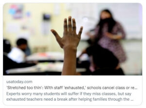 COVERING EDUCATION, OR COVERING EDUCATORS? Every week, I come across stories that concern me, often because they lack helpful context, seem aimed at frightening readers, or are focused on educators’ experiences above all else. This week was no different. In addition to the Gothamist headline above, there was the New York Times’ ‘I Don’t Want to Die for It’: School Board Members Face Rising Threats, which is typical of the fear-amplifying journalism that has come to characterize coverage from the Times and others. Another concerning story was USA Today’s With staff ‘exhausted,’ schools cancel class or return to remote learning, which gave little voice to parents and students. Remember: it’s the education beat you’re on — not the educators beat.