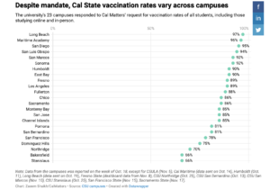 Above: CalMatters College Beat journalists built their own database on Cal State vaccination rates with the help of former L.A. Times education reporter Sonali Kohli. Their reporting showed how enforcement of the vaccine mandate differs by campus — and why that’s a problem.
