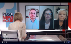 Above: Colorado Public Radio’s Jenny Brundin (center) was on the PBS NewHour to talk about heated school board races with host Judy Woodruff , Grant Gerlock of Iowa Public Radio (left), and Jo Ingles of Ohio Public Radio (right).