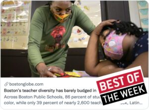 🏆 BEST: The best story of the week is Boston’s teacher diversity has barely budged in 10 years. District leaders hope the next decade will look different by Naomi Martin in the Boston Globe. It’s the third part in their series on educator diversity. In Boston, 85% of students in public schools are not white, but only 40% of school teachers and guidance counselors are people of color. That’s despite a federal court order and the creation of several programs meant to address this gap. Why does it persist? One problem is retention: hiring and then keeping teachers of color. Another, some say, is that the district isn’t prioritizing teacher diversity enough. “There’s lip service to it, maybe even some effort, but there’s no commitment to making sure that it happens,” said one former Boston School Committee member.