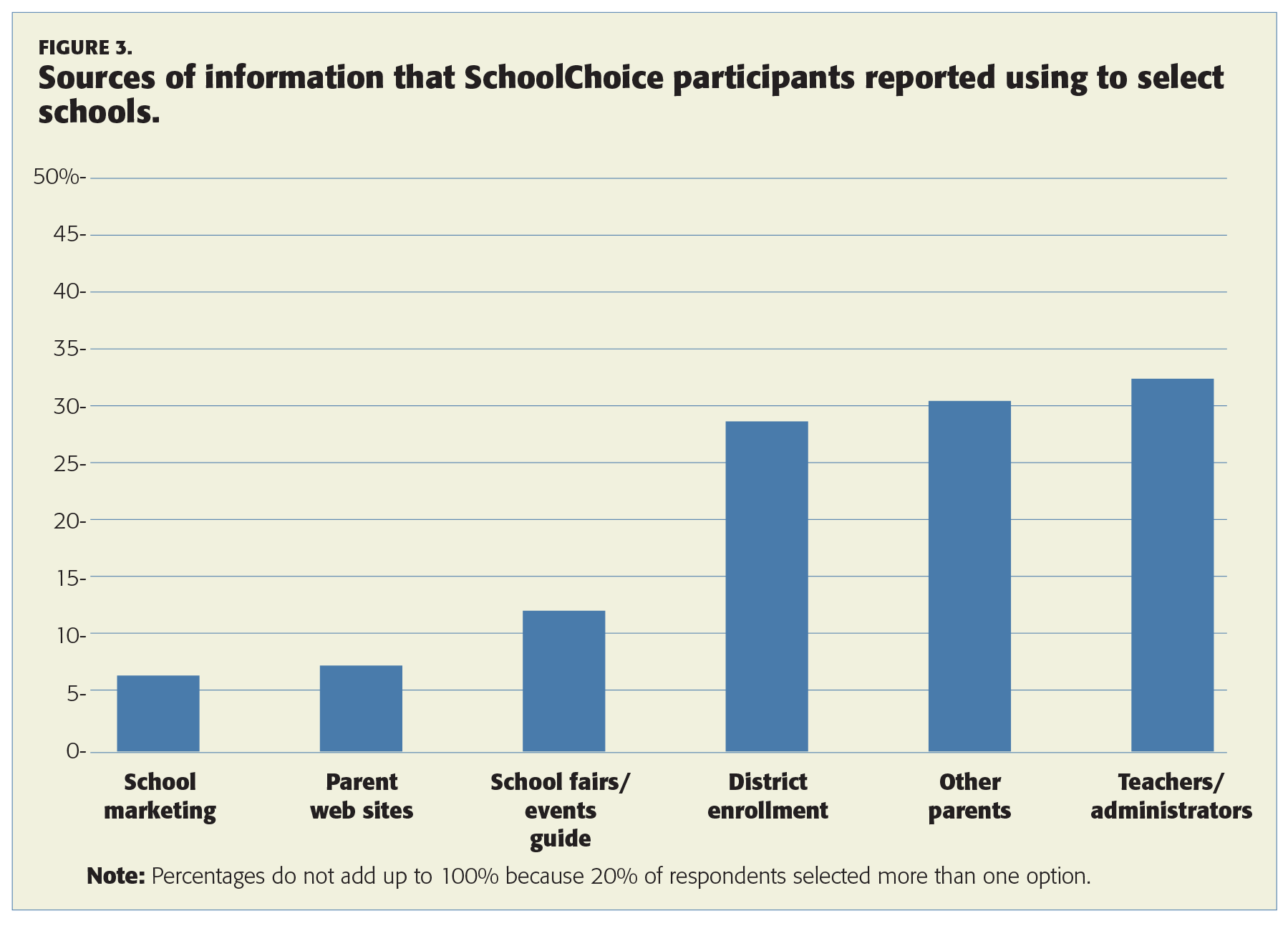 A related piece of the solution is to promote access to academic information on parent web sites. After accounting for relevant factors such as parent demographics and location, researchers found that survey respondents who said web sites were the “most useful information” they consulted when selecting their first-choice school ended up picking first-choice schools with significantly higher academic ratings. DPS and the Colorado Department of Education already offer extensive online data, but there is room for expansion: Just 7% of choice participants used parent web sites to select schools, while parents continue to depend more on information from existing social networks.