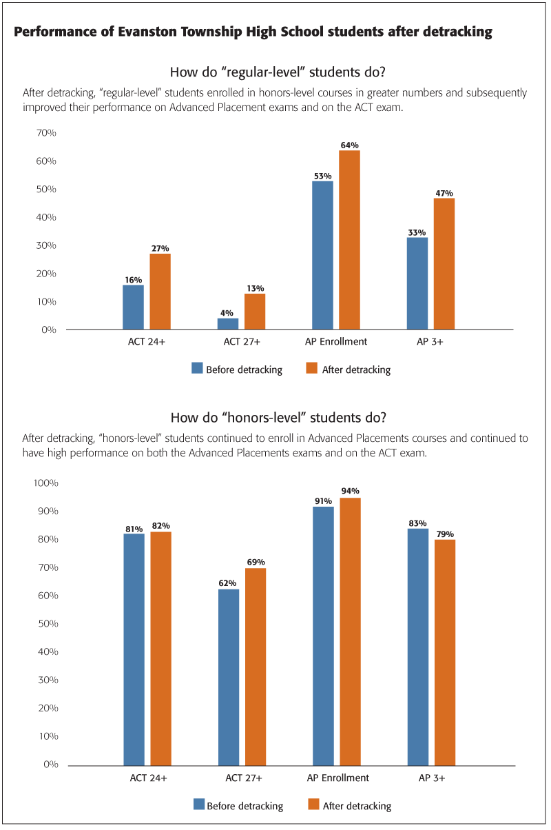In 2010, Evanston Township High School dramatically changed its freshman year for incoming students. The school detracked freshman English, history, and biology courses for the vast majority of students — and, by doing so, removed barriers for historically under-represented student groups and provided greater access and opportunity to all.