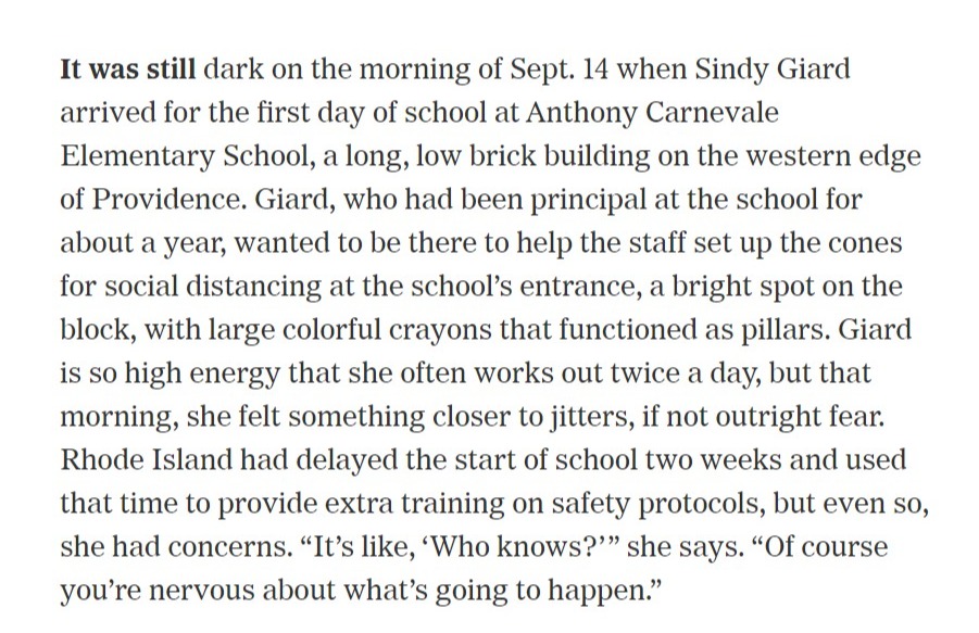 Dominus: The story I wrote is about the state of Rhode Island, where Gov. Gina Raimondo had decided back in June, unlike most blue state governors, that she was going to make opening the schools a major priority. I was curious to see how she was able to do that — and also about what the experience was like for teachers, working in schools in a state where COVID rates were extremely high.