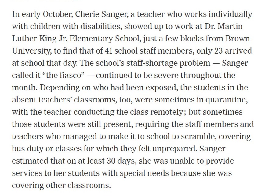 Dominus: I focused on Providence, where the school year was extremely challenging and there were a lot of disruptions because of quarantines. The case numbers were high in the community, which meant that cases were also inevitably cropping up in the schools, and that also created a lot of stress. Contact tracing was overwhelmed, so it was hard for people to know the origins of the COVID-positive cases, but there was no report (from the union, at least) of in-class super-spreading events, and by the end of January, many of the teachers I spoke to, and one union representative, said that staffing, more than safety, felt like the real issue.