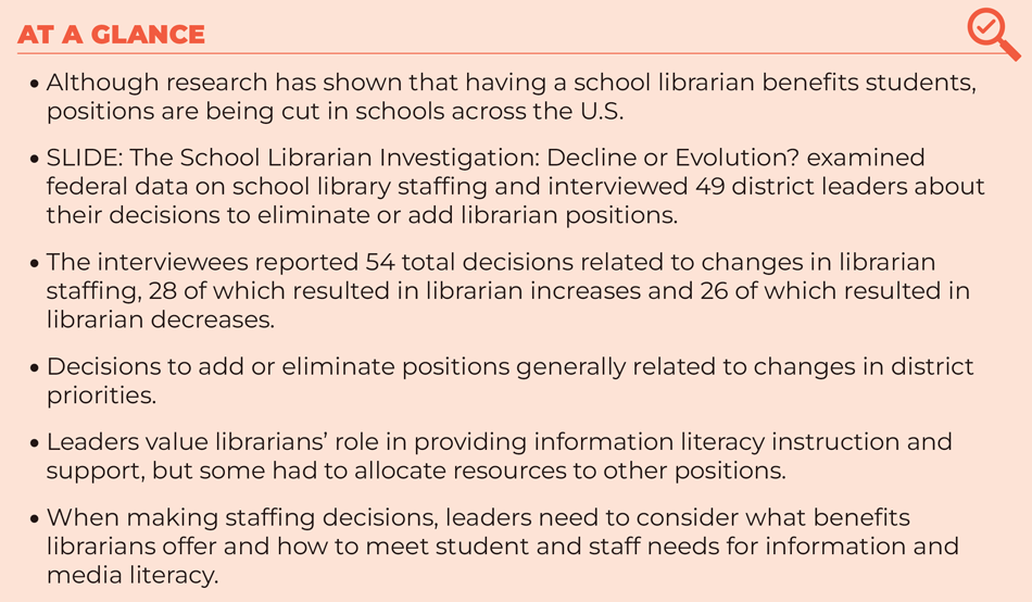 K-12 students today need to become competent in evaluating information that bombards them daily. The 49 district administrators we interviewed shed light on the realities of staffing school library instructional programs. Many school leaders shared their own experiences of working with and having to make decisions about school librarians. Making staffing decisions isn’t easy, but it’s essential that leaders carefully consider how they can ensure students build information and media literacy and the role of school librarians in addressing that priority.