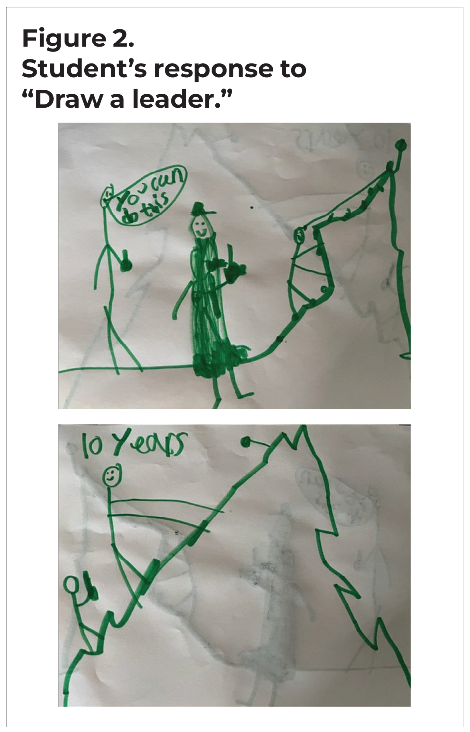 We also asked a different group of students to draw a leader. This yielded several interesting responses, but our favorite was a student’s drawing that showed a leader helping someone climb to the top of the mountain to press a button. While we were uncertain about the button’s purpose, the picture clearly demonstrates key components of a broader leadership definition, including a leader offering motivation and support to accomplish a specific goal. This student extended this leader’s influence on the back of the drawing with a picture of the original climber leading a new climber 10 years later (see Figure 2).
