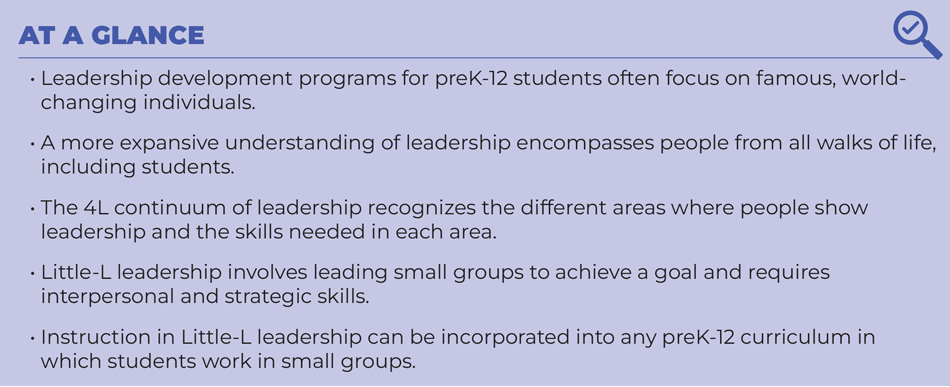Curriculum developers can create engaging lessons and activities that mirror real-world small group dynamics, providing students with authentic experiences to enhance their interpersonal and teamwork skills. Leadership education that is relevant, impactful, and applicable to all students’ immediate experiences builds a more comprehensive understanding of leadership. Knowing specific components of leadership and examples of how students can display these skills enables teachers to embed intentional instruction and assessment of these skills in every classroom.
