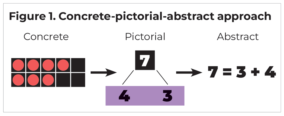 Students need to interact with mathematics through concrete tools before they can effectively model scenarios with pictures or understand abstract representations. However, this approach is not linear. Students who have mastered abstract reasoning for one mathematics concept (such as basic addition) might need to return to using physical objects when learning something new (such as adding fractions).
