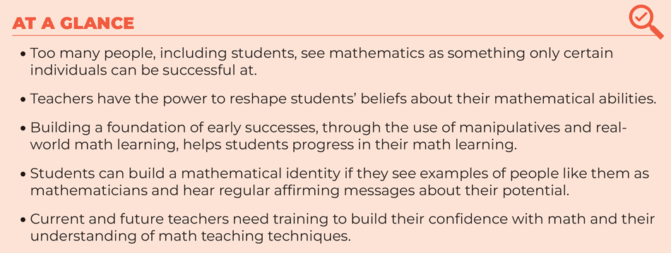 The messages we send students about mathematics have the potential to build students’ confidence and help them establish their mathematical identity. We have the power to change the narrative about who can do and enjoy mathematics because everyone is — or can be — a math person. Targeted and easy-to-implement approaches that affirm students’ abilities can strengthen students’ mathematical foundations and build their confidence.
