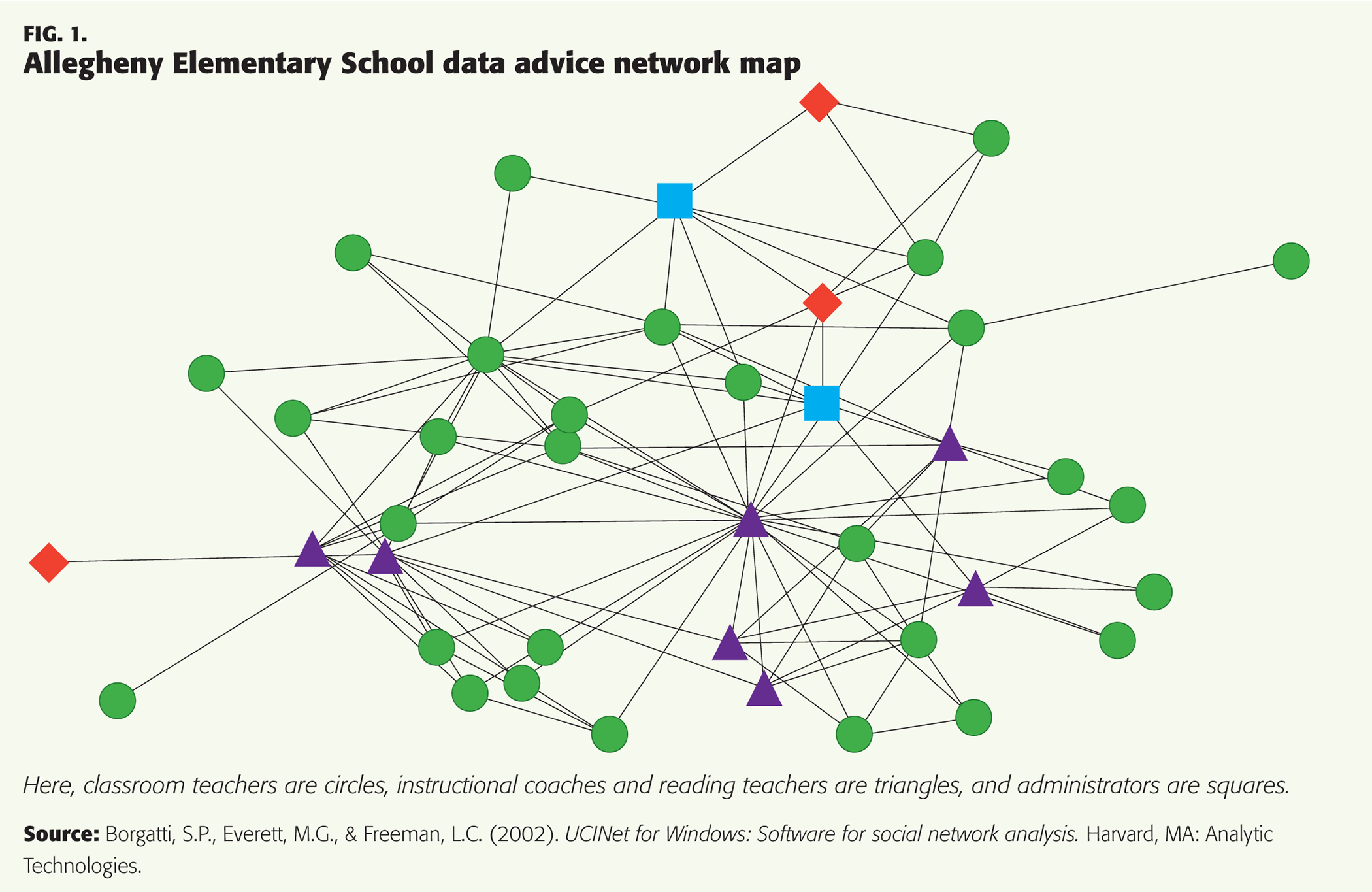A colleague who was studying a school’s use of data began by following teachers’ suggestions to talk with the instructional technology coordinator. Expecting a conversation about how technology enables data use, our colleague was surprised by the coordinator’s thoughtful and powerful approach to supporting teachers’ use of data. The coordinator had written the names of all the school’s teachers on a board, connecting those who worked well together with lines, and organizing names into groups based on their interaction. He had mapped out who worked well with whom, who took advice from whom, and who was unlikely to talk to or listen to advice from anyone else. He was using the map strategically to support the use of the new data system, tailoring his approach to different teacher groups, and focusing efforts where he’d have the greatest effect. The IT coordinator was on to something: He understood that the underlying structure of the school could be a powerful way to move the initiative forward.