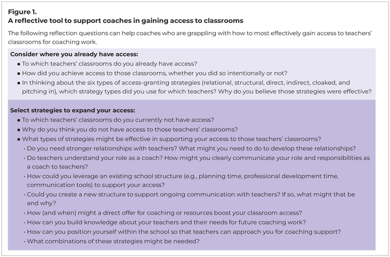 Gaining access to classrooms for coaching is deliberate — and often invisible — work. We sought to understand this aspect of coaches’ work precisely because it is a necessary condition for the deeper work of coaching. We found that coaches use a complex and flexible network of strategies for gaining access. By making this work visible, we seek to make it available to new and veteran coaches.