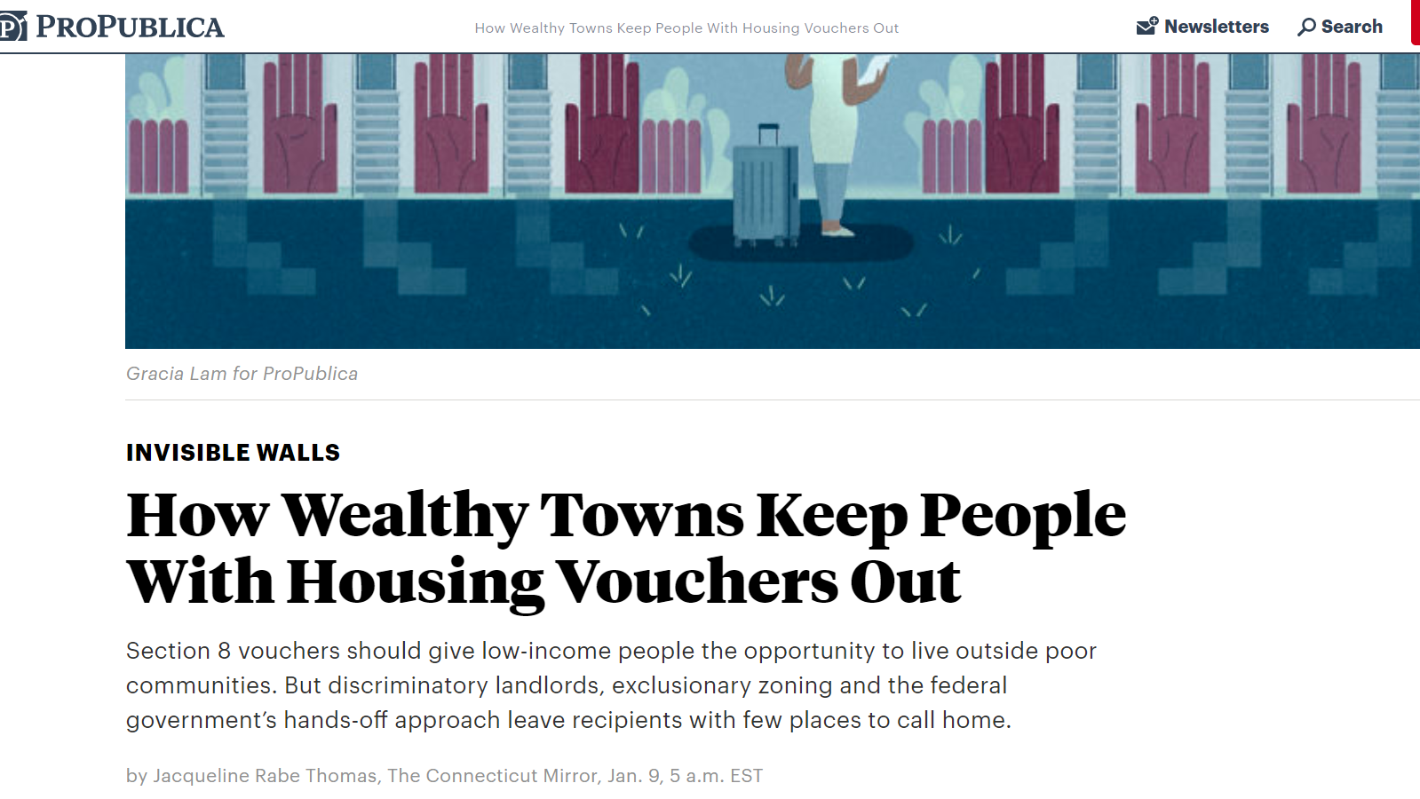 This was part of Invisible Walls, a nine-part series highlighting the ways in which Connecticut’s housing segregation illustrates a national problem. Her editor, Elizabeth Hamilton, describes the series as “some of the most important work that any journalist in Connecticut has done in the last year and a half.”