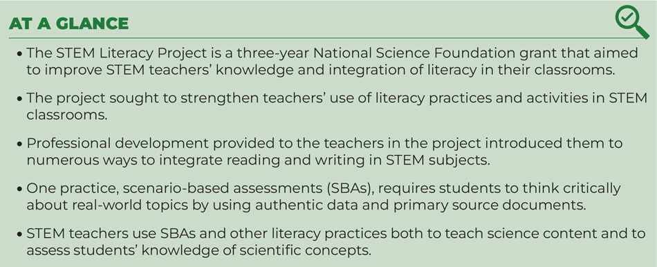 Amanda, Kathryn, and Jerome (pseudonyms) investigated these real-world STEM topics in their high school science classes. Their teachers were part of the STEM Literacy Project (www.stemliteracyproject.org), a three-year National Science Foundation grant that aimed to improve STEM teachers’ knowledge and integration of literacy in their classrooms. Studying topics that affect people and communities helps students see the relevance of what they are learning in school. However, studying a current issue is not enough. We need an approach to equip students with the sense-making skills that emerge through literacy instruction. The STEM Literacy Project sought to enable STEM teachers to bring more literacy activities into their classrooms.