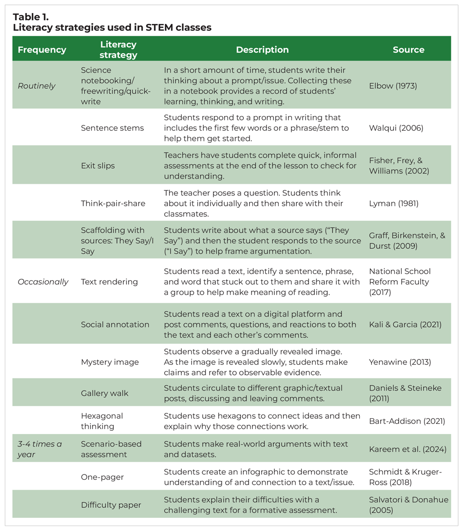 Science or math concepts were at the core of each professional development session for our program. We wanted to help teachers embed content literacy activities into classroom routines, instead of having them become just “one more thing” added on top of the rest of their instruction. Table 1 shows a snapshot of the most-used literacy strategies that STEM teachers found to be valuable in their classrooms. Some of these strategies became part of the daily routine, and others were more occasional additions.