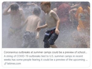 Above: The speculative, fear-amplifying headlines just keep coming. This one is from a recent Associated Press story that later on notes that summer camps are likely to be much more risky than school. Thanks to Anthony LaMesa for flagging it.
