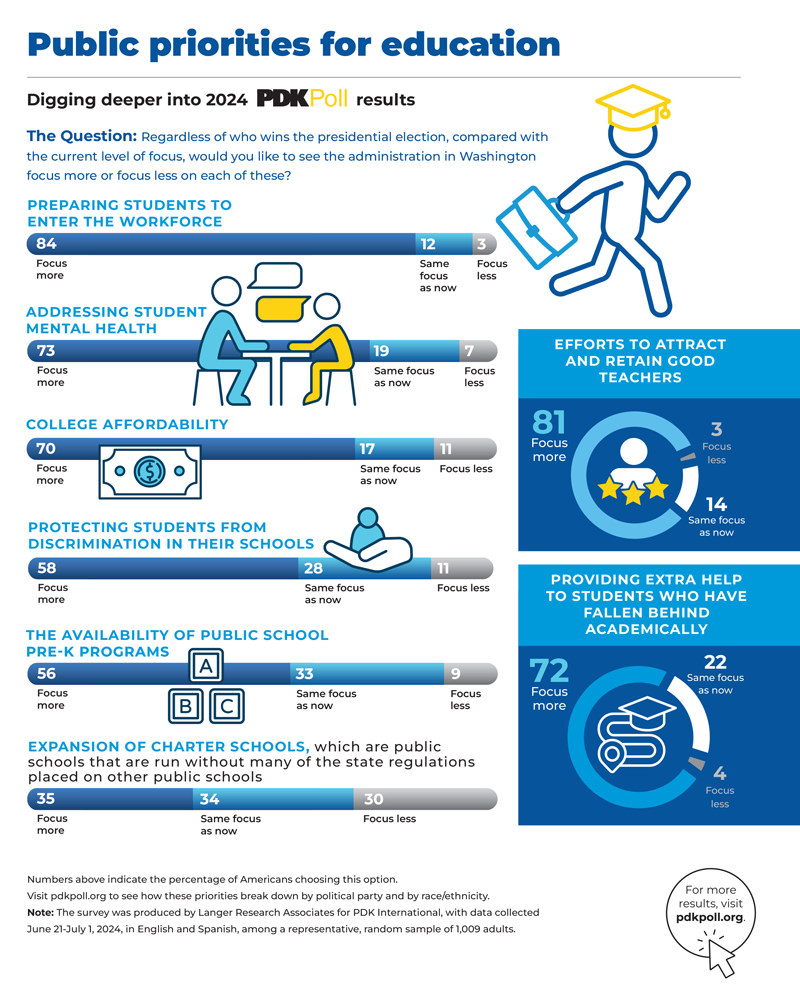 Public priorities for education Sep 30, 2024 | Poll Points 0 (0) This article appears in the October 2024 issue of Kappan, Vol. 106, No. 2, p. 64. How useful was this post? Click on a star to rate it! Submit Rating Average rating 0 / 5. Vote count: 0 No votes so far! Be the first to rate this post.