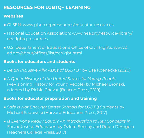 Even if educators are on board with including LGBTQ+ experiences in their classrooms, many feel ill-prepared to do so correctly and authentically. Therefore, schools, districts, and states need to be proactive about providing quality training to all their educators from preK all the way through the 12th grade (Brant & Wilcox, 2021). This is an area of concern even in communities that support the inclusion of LGBTQ+ topics. For example, even though the California FAIR Education Act requires educators to integrate age-appropriate information about LGBTQ+ Americans in social studies curriculum, teachers did not receive the resources to do so. Instead, the bill relied on individual educators’ compliance and background knowledge (Burdge et al., 2013).