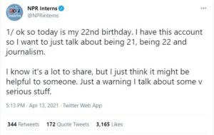 | “I love this thread,” tweeted EdWeek’s Evie Blad about a viral series of tweets from @NPRinterns describing the struggles of being a young journalist these days. “And the answer isn’t ‘don’t worry that you don’t work at Important Outlet X or you didn’t win Important Award Y because you probably will some day.’ The answer is ‘maybe what you’re doing right now matters more than you think.’” |