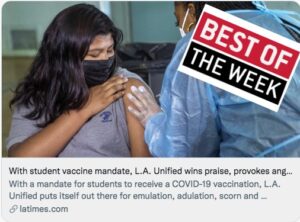 | 🏆 BEST: The best story of the week is With student vaccine mandate, L.A. Unified wins praise, provokes anger by Howard Blume and Melissa Gomez in the Los Angeles Times. LAUSD is the first and only large district to mandate vaccines for students. Will other districts follow suit? “Probably not — at least not right away,” according to Blume and Gomez, in part due to concerns about parent opposition and the obstacles it creates for vulnerable students returning to class. But all eyes will be on L.A. to see what difference the mandate makes. One reason why LAUSD was able to pass the measure is that it had support from both major statewide teachers unions. Also, nearby Culver City Unified, a much smaller district, approved what’s believed to be the first vaccine mandate for students in the state several weeks ago, and it appears largely successful. Up next? Possibly Oakland, which introduced a resolution last week. For more on student vaccines, check out the latest NYT education newsletter.