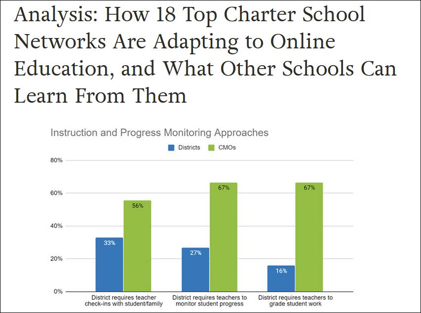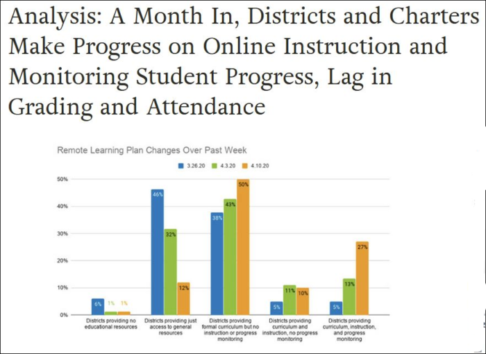 Above: In an April 21 follow-up published in The 74, CRPE highlighted progress and challenges for district and charter school remote learning programs.