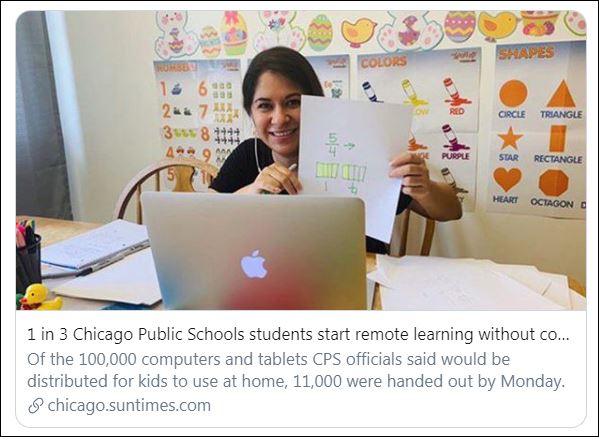 Yesterday was Chicago’s first day of remote learning, after almost a month, and it’s not going very well from what I can tell. Check out coverage from the Sun-Times, WTTW, CBS2, CBS, and the Tribune.