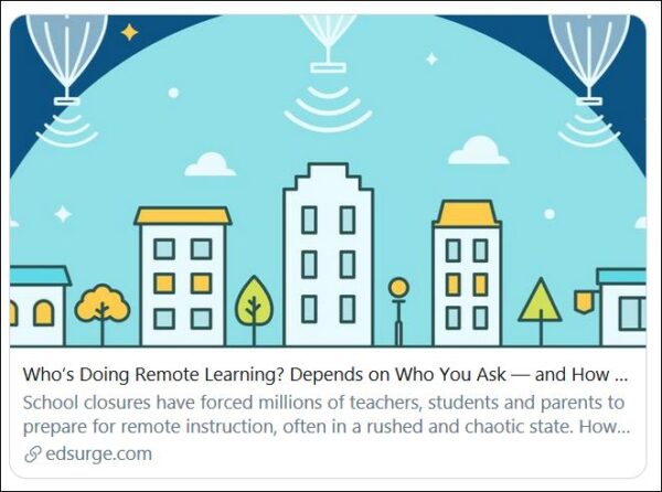 We now have at least three different survey results related to remote learning to look at, including Gallup, Common Sense, and the Education Trust-West. The Los Angeles Times has a writeup of the EdTrust-West results. EdWeek has a writeup of the Gallup findings. EdSurge attempts to compare two of the poll results: Who’s Doing Remote Learning? Depends on Who You Ask — and How Wealthy They Are (above).