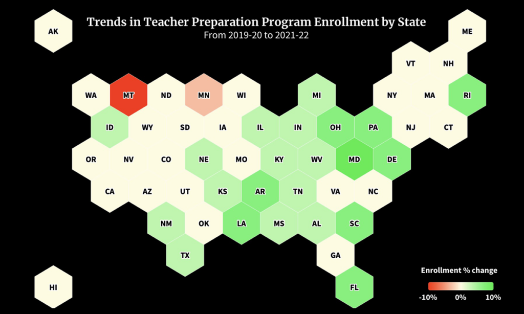 Above: In the interest of sharing positive news, The 74 reported that enrollment in teacher prep programs increased or stabilized in 40 states during the pandemic, though the growth doesn’t yet match hiring demand.