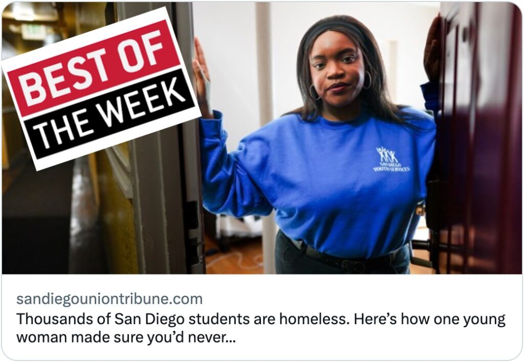 The best education journalism of the week is Thousands of San Diego students are homeless. Here’s how one young woman made sure you’d never notice her by the San Diego Union-Tribune’s homelessness reporter, Blake Nelson. He offers readers a detailed look into the difficult day-to-day lives of homeless students, turning a news story into one that reads like the best non-fiction.