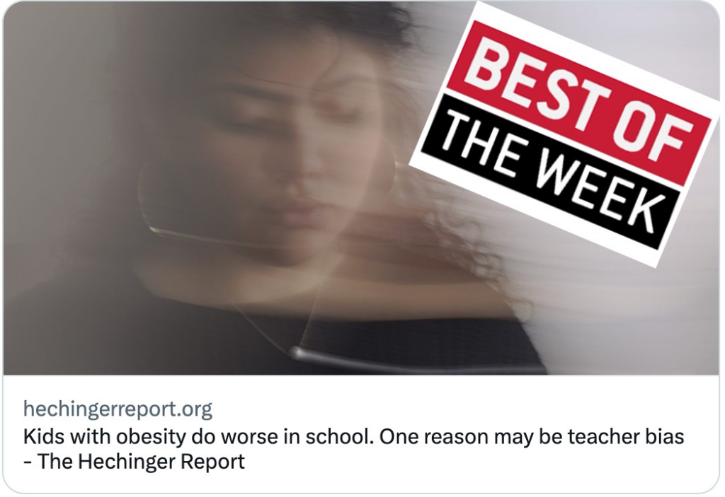 The best education journalism of the week is Kids with obesity do worse in school. One reason may be teacher bias by Kavitha Cardoza for The Hechinger Report.