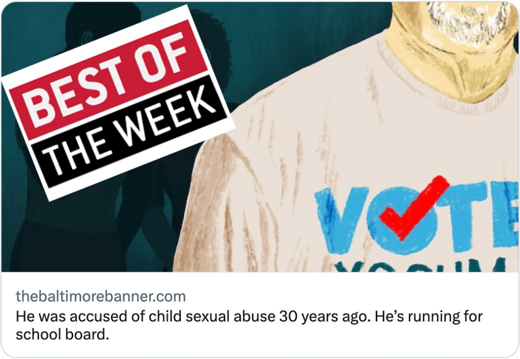 The best education journalism of the week is He was accused of child sexual abuse 30 years ago. Now he’s running for school board by Liz Bowie and Dylan Segelbaum of the Baltimore Banner.