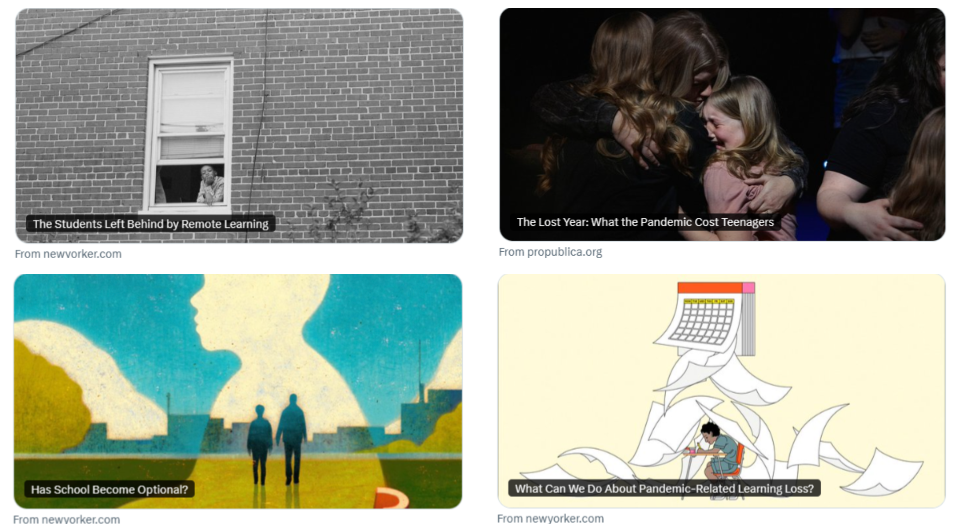 Above, clockwise from top left: Four previous stories through which MacGillis has explored the links between COVID-era school closings and challenges facing American schools: The Students Left Behind by Remote Learning (2020), The Lost Year (2021), What Can We Do About Pandemic Learning Loss? (2023), and Has School Become Optional? (2024).