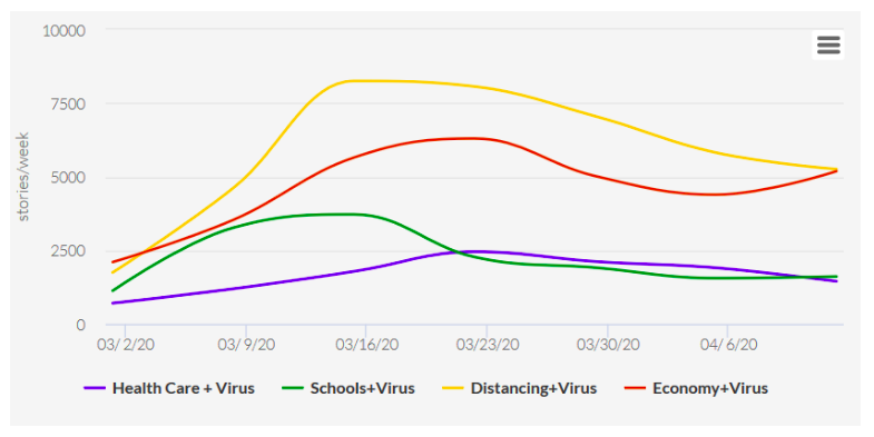 To put these numbers in context, last week’s numbers are still considerably lower than those from mid-March, both in terms of quantity and in terms of the percentage of overall COVID-19 stories.