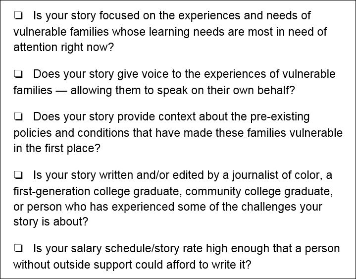 Not all of these items are required for every story that you write or publish, and — just as an example — journalists of color can also fall prey to racial blind spots or stereotypes. However, these issues of inclusivity and representation come up again and again in education journalism, and COVID-related education coverage is no different.