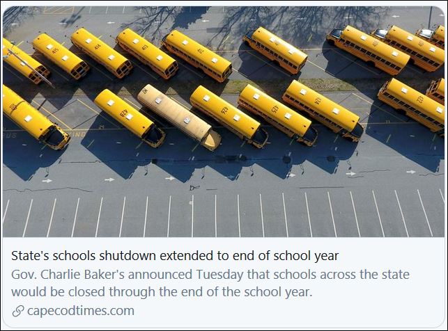 Above: Images of big groups of parked school buses are the new way to to depict shuttered school systems, notes MA’s Tracy O’Connell Novick.