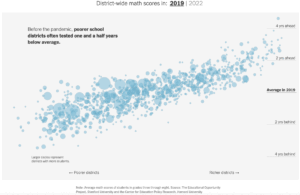 ⏰ District-level learning loss research: By the spring of 2022, the average student was half a year behind in math and a third of a year behind in reading — exacerbating pre-existing inequalities among districts. School closures and hybrid learning played a major role but were far from the sole factor. These are the findings from new research from Stanford and Harvard, whose researchers call for major increases in instructional time before losses become permanent. The project now includes a district-level view of the pandemic’s effects in 40 states (plus D.C.) and an interactive map comparing neighboring school districts. The results have been written up in the opinion sections of the NYT and the Idaho Statesman and reported on NPR’s Morning Edition.