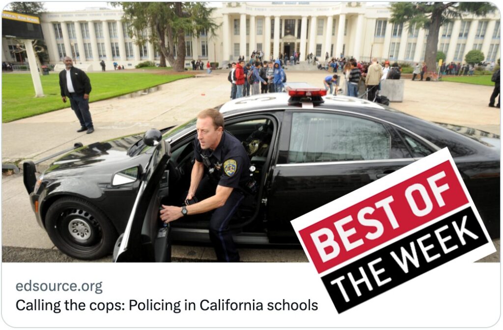 The best education journalism of the week is Calling the cops: Policing in California schools by EdSource’s Thomas Peele and Daniel J. Willis, with local reporting from Emma Gallegos, Lasherica Thornton, Mallika Seshadri, and Monica Velez.