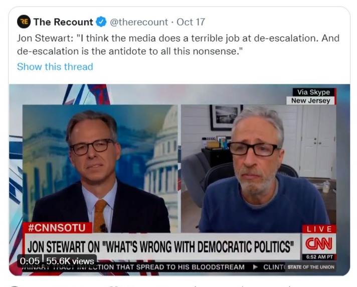 “I think the media does a terrible job at de-escalation,” former Daily Show host Jon Stewart recommended to CNN’s Jake Tapper last weekend, urging media outlets to stop fanning emotional fault lines and start “focusing on things that are more urgent and elemental in people’s lives.”