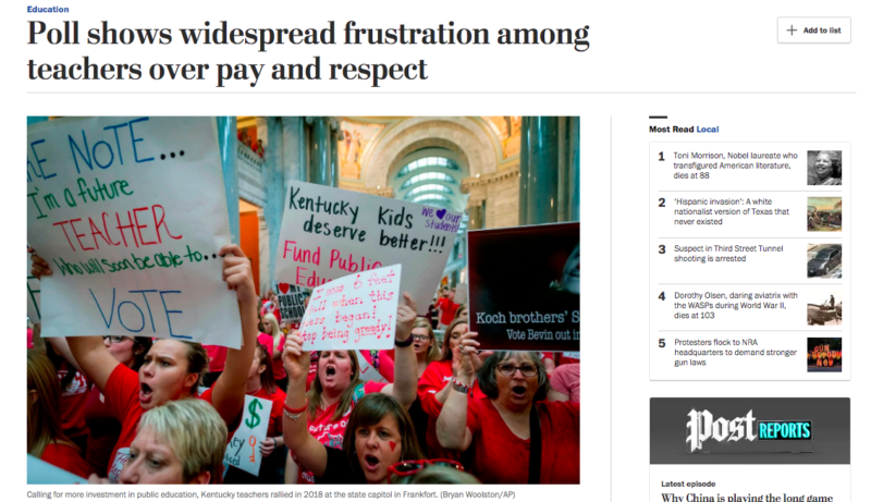 “Half of teachers say they have seriously considered leaving the profession, and most said they would strike if given the opportunity,” reported the Washington Post. “Most said they would not want one of their own children to follow them into teaching.”