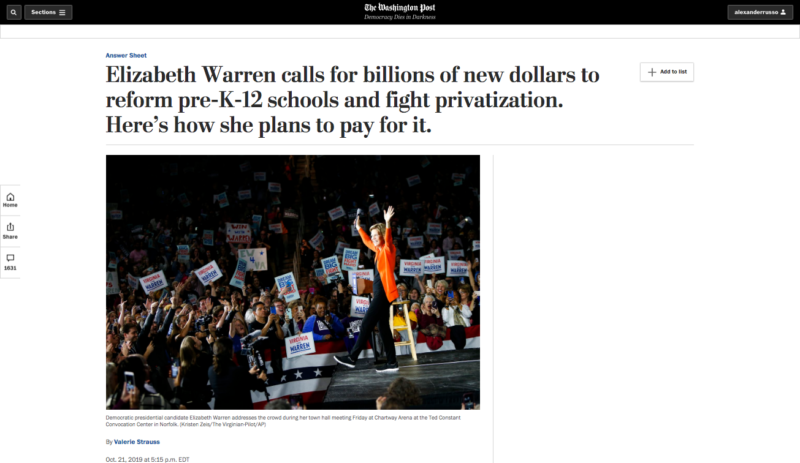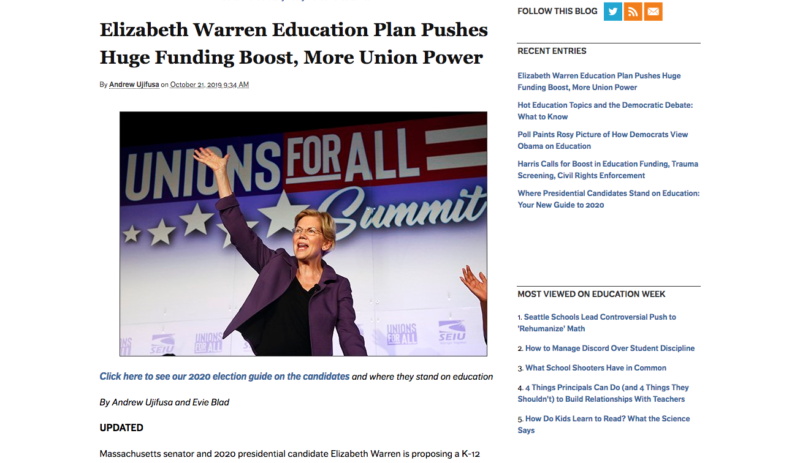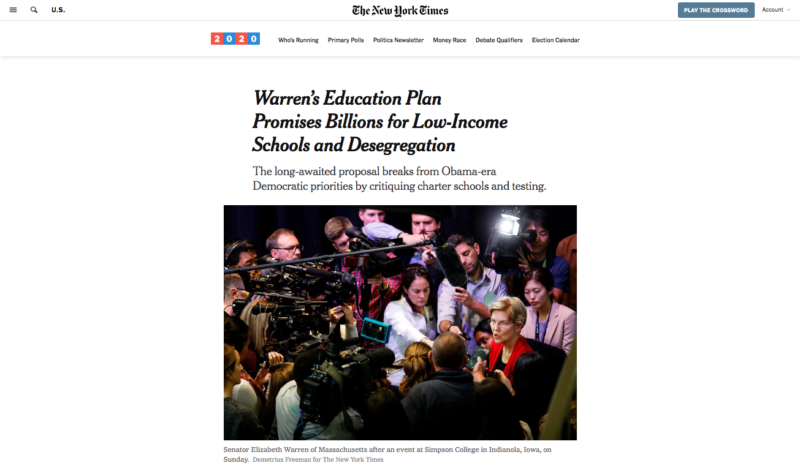 *Some of the coverage made too much of the plan’s charter school provisions. The semiautonomous public schools may be a teachers union boogeyman, but they remain obscure and unimportant in the vast majority of school districts around the country. The attention might be a function of the media’s and some advocates’ obsessions with the topic rather than a true headliner. For a somewhat more expansive view, check out the New York Times coverage, which focuses on the broader aspects of Warren’s plan such as funding for poor schools and racial integration.